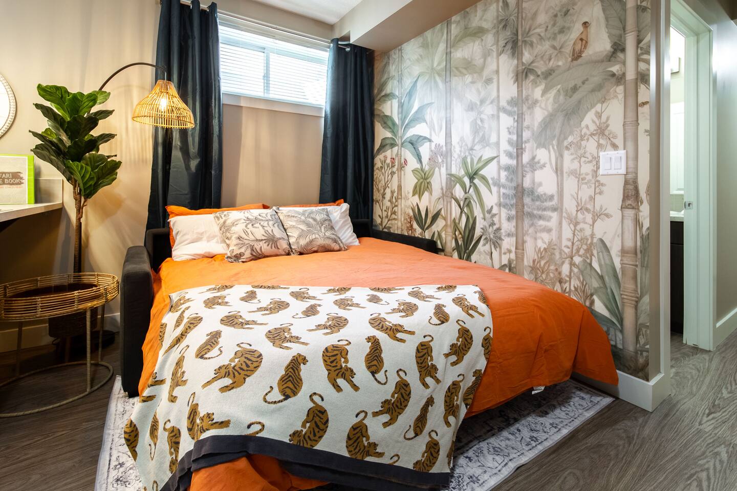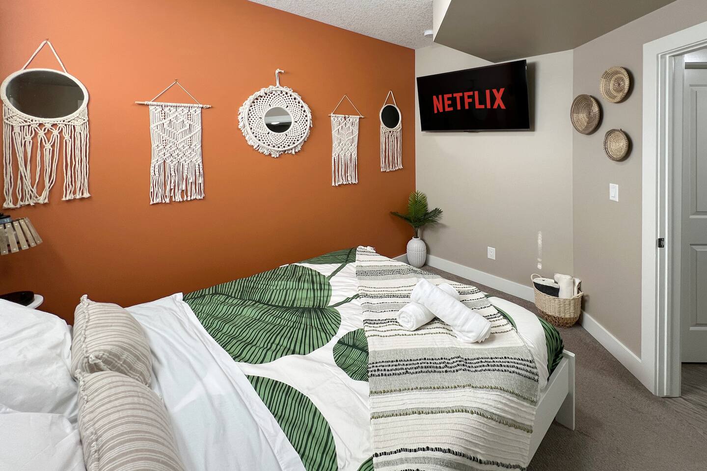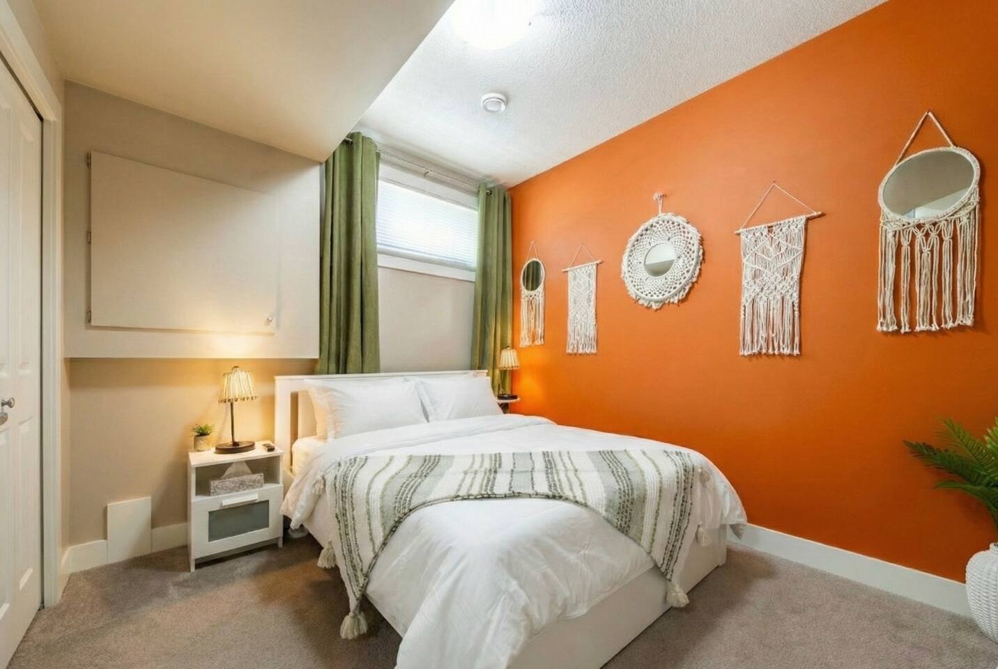 Welcome to your cozy, bohemian-inspired jungle retreat! Enjoy a peaceful, clean space with two luxurious queen beds, memory foam mattresses, and blackout curtains for restful sleep. The 55” smart TV with free Netflix, high-speed Wi-Fi, and board games will keep you entertained. With free parking, a fully stocked kitchen, and a nearby park, you'll have everything you need. Perfect for couples, families, work crews, or anyone seeking comfort and convenience!