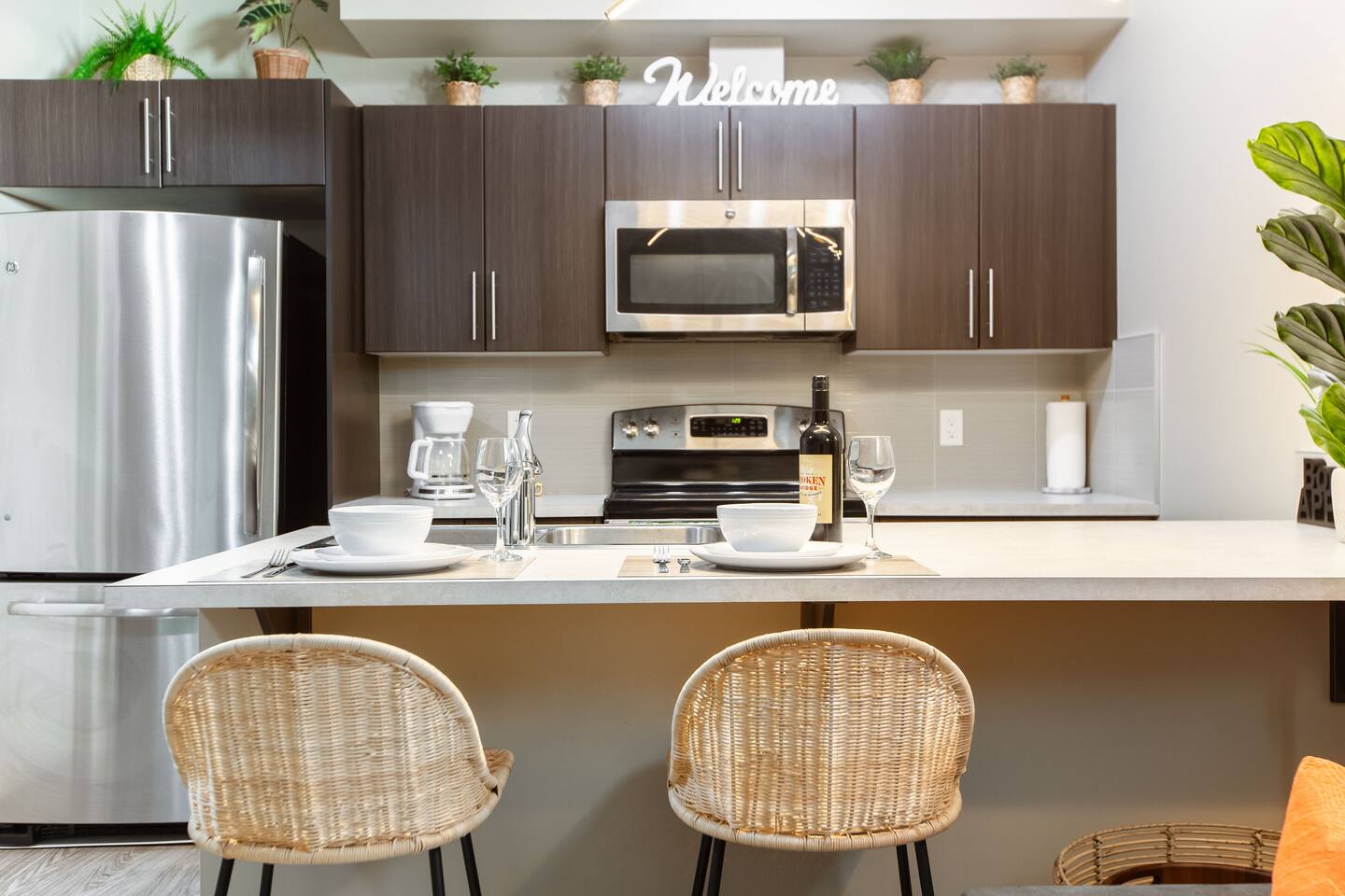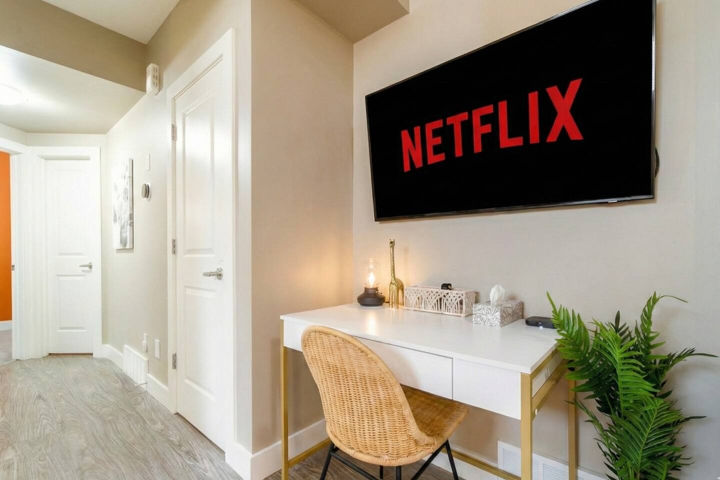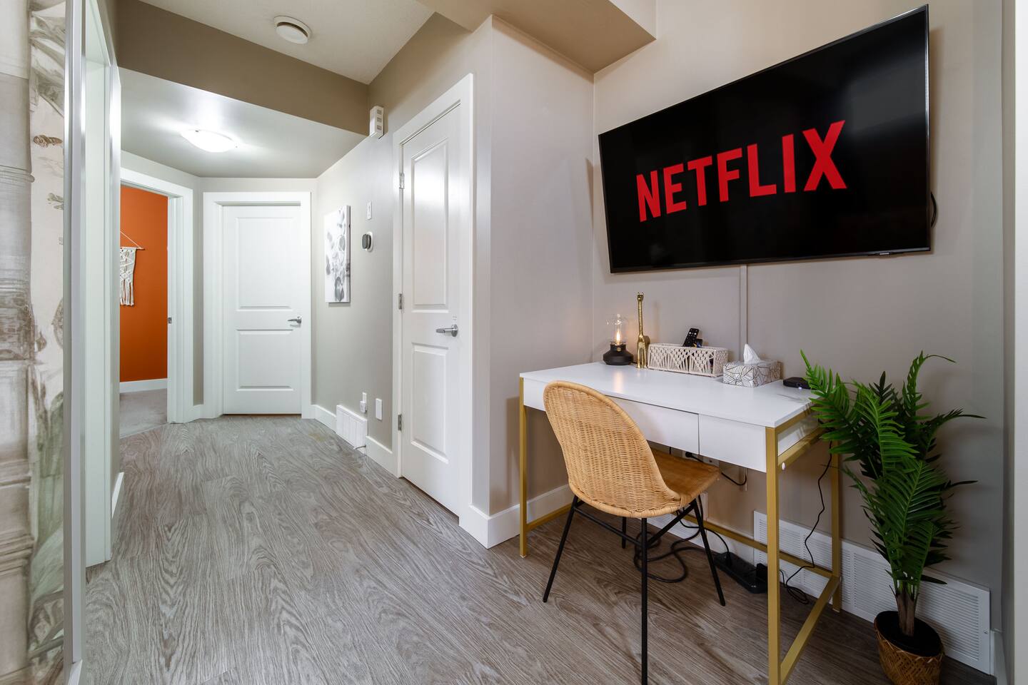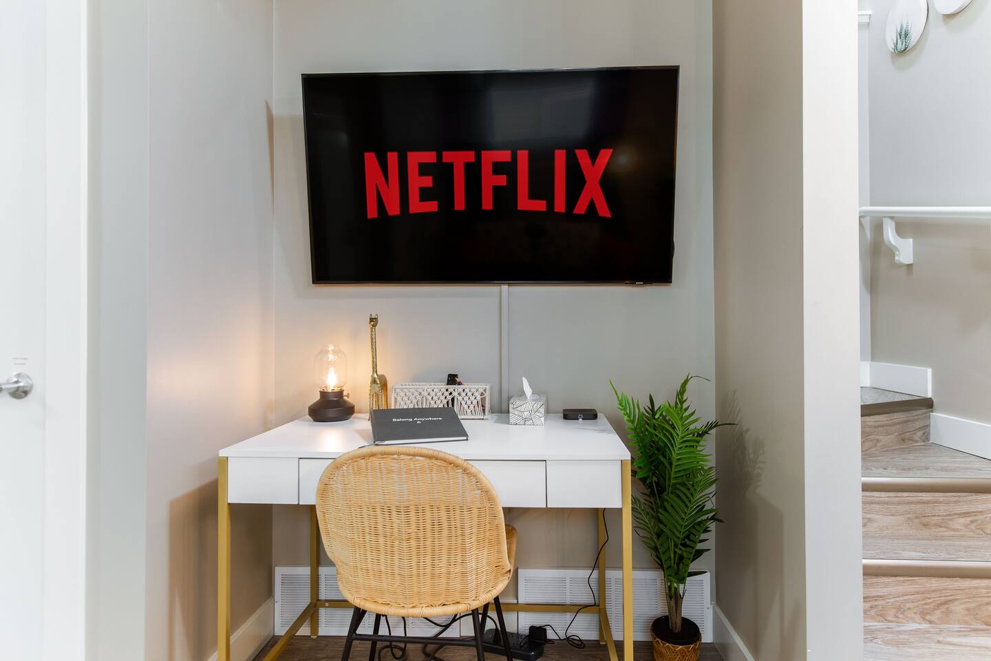 Welcome to your cozy, bohemian-inspired jungle retreat! Enjoy a peaceful, clean space with two luxurious queen beds, memory foam mattresses, and blackout curtains for restful sleep. The 55” smart TV with free Netflix, high-speed Wi-Fi, and board games will keep you entertained. With free parking, a fully stocked kitchen, and a nearby park, you'll have everything you need. Perfect for couples, families, work crews, or anyone seeking comfort and convenience!