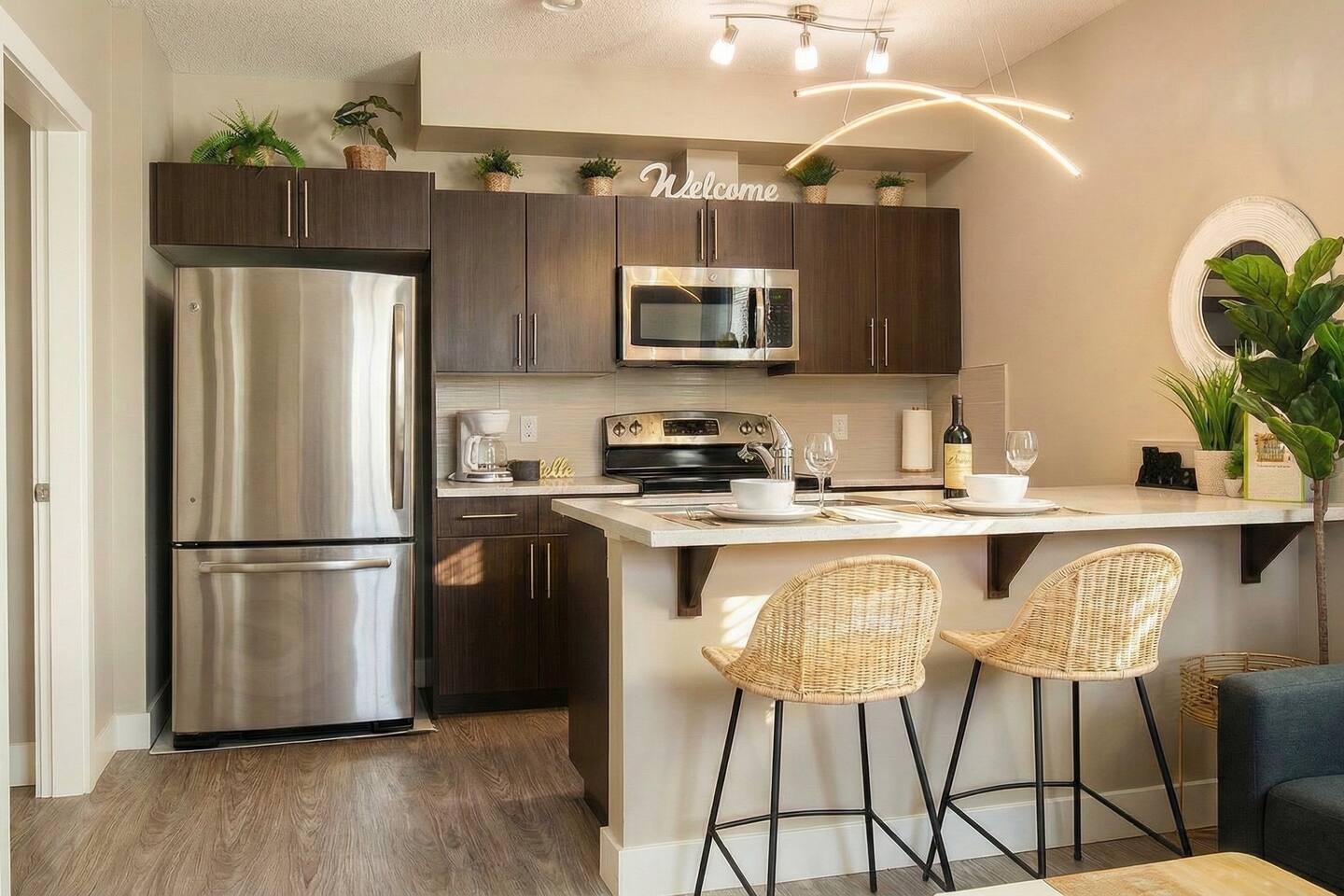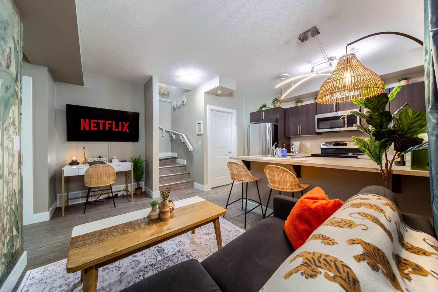 🚗 Free Parking: We offer convenient and complimentary parking for our guests. ✅ Dedicated Parking Pad: Park your on a reserved parking pad behind the home. ✅ Ample Street Parking: There is plenty of street parking available. 🛌 Rest and Relaxation: Unwind after a day of exploring or working in our luxurious and tranquil haven: ✅ Queen Bed: Master bedroom with a luxurious Queen bed, walk-in closet, and 50” TV (sleeps 2). ✅ Queen Sofa Bed: Cozy living area with a queen size sofa bed (sleeps 2). ✅ Quality Sleep: Memory foam mattresses and blackout curtains in every room for a perfect night's sleep. ✅ Pack ‘n Play: Pack 'n Play available for your little one. ✅ Temperature Control: Climate control with central heating, space heater, and a smart thermostat. The place is usually cool enough that AC is not needed. ✅ In-Suite Laundry: Enjoy the convenience of in-suite laundry facilities, including a washer and dryer. 🎬 Play & Entertainment: Our Jungle Retreat is packed with fun for all ages. ✅ Smart TV: 55” smart TV loaded with FREE Netflix, Disney+, Apple TV, Prime and cable (including sports package). ✅ Board Games: Board games for family and friends game night. ✅ Wi-Fi: High-speed optic Wi-Fi (300+ Mbps) for seamless connectivity. ✅ Nearby Outdoor Recreation: Explore nearby walking trails, playgrounds, a tobogganing hill, and a beautiful 75-acre lake. ✅ Nearby Gyms & Swimming Pool: Close to the Meadows Rec Centre and GoodLife Fitness. ✅ Nearby Movie Theatre: Landmark Movie Theatre is only 5 minutes away. ✅ Easy access to City Attractions: Easy access to Whitemud Drive and Meadows Transit Centre Park n’ Ride for trips to major attractions only a 25 min drive away. 🎢 West Edmonton Mall 🏢 Downtown Edmonton 🏒 Rogers Place 🍽️ Dining & Gathering: ✅ Fully Stocked Kitchen: Fully stocked kitchen with everything you need to prepare delicious meals. ✅ Nearby Grocery and Restaurants: Just minutes away from Walmart, Superstore, and a variety of restaurants, including fast food and full-service options like Browns Social House and Montana's. Skip the Dishes delivery available! 👷Working: The Boho Jungle is an excellent choice for business travelers and crews working in Edmonton: ✅ Crew-Friendly Setup: two comfortable queen beds for relaxing after a long day's work. ✅ Long-Stay Discounts: Excellent discounts available for extended projects and contracts, making your crew's stay more affordable. ✅ Close to Industrial Areas: Conveniently located near key industrial areas: 5 minutes from 17th Street Maple Ridge Industrial Neighborhood, and only 15 minutes from Strathcona Oil Refinery and Suncor Refinery. ✅ Meal Prep Made Easy: The fully equipped kitchen allows your crew to prepare their own meals, saving on restaurant costs. ✅ High-Speed Internet & Desk: Stay connected with high-speed internet access and work desk. ✅ Easy Access: Quick access to Sherwood Park and major highways (Whitemud Drive, Sherwood Park Freeway, and Anthony Henday) makes getting to and from job sites a breeze. ❤️ What Guests Love About This Home ✅ Warm and Responsive Hosts: “Stephan and Alexis were such amazing hosts! They were very responsive to any questions and super warm.” ✅ Clean and Fully Stocked: “The place was beautiful, clean, and had everything I needed. It felt like home.” ✅ Comfortable Sleeping Arrangements: “Memory foam mattresses and blackout curtains made for a perfect night’s sleep.” ✅ Great Location: “Close to gyms, grocery stores, and lots of restaurants, plus easy access to attractions!” ✅ Well-Stocked Kitchen: “The kitchen had everything I needed to prepare meals, making my stay so convenient.” Book Your The Boho Jungle Stay Today! ⭐️⭐️⭐️⭐️⭐️ Don't miss out on this exceptional Edmonton retreat. Our calendar fills up quickly, so secure your stay today! Contact us with any questions – we're happy to help.